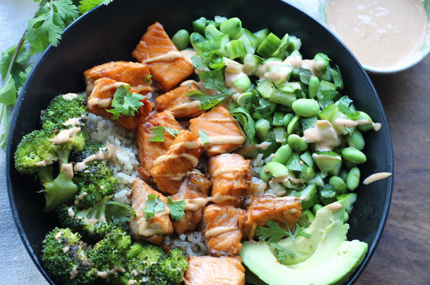 Perfect for busy weeknights and ready in a flash, this vibrant bowl features tender salmon bites glazed in sweet-and-spicy hot honey, roasted with broccoli, and served over brown rice (or cauliflower rice). It’s finished with a fresh cucumber-edamame lime salad, creamy avocado, and a drizzle of spicy mayo. Packed with protein, fiber, and heart-healthy fats from salmon and avocado, it’s a nourishing, feel-good meal that doesn’t sacrifice flavor.